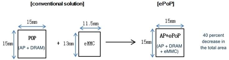 A memória ePOP ocupa o mesmo espaço físico que uma CPU convencional para smartphones, com apenas 1,4mm de espessura. Esse modelo será muito visto no mercado de telefonia do ano de 2015 e pode ser adotado por outros fabricantes ao longo desse período.