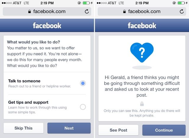 A ferramenta do Facebook também apresenta o recurso que pergunta ao usuário que foi indicado como possível suicida, se ele está precisando de ajuda, se ele deseja ter dicas de apoio ou se ele deseja falar com alguém sobre seu problema.